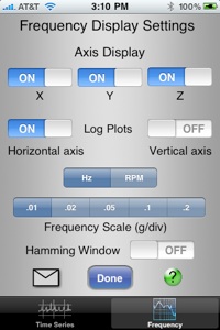 The three axis display switches allow the user to turn individual frequency plots on and off in order to see more detail eliminating the clutter of the other plots. These switches are only visible when at least one of the two axes is in Log mode. When both switches are in Linear mode the three plots are automatically plotted separately in a stacked plot.