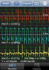 The time series view displays the acceleration vs. time values for each of the three accelerometers. This is also the view where the sample process is initiated.