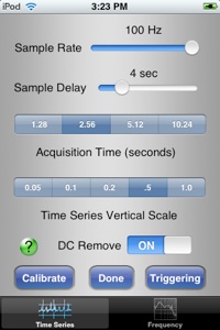 The sample delay slider allows the start of sampling to be delayed from 0-20 seconds after pressing the Sample button. This allows sample button to be pressed and the iPhone to be positioned for the best sampling before acquisition begins. The remaining delay time is displayed on the screen as the countdown progresses.